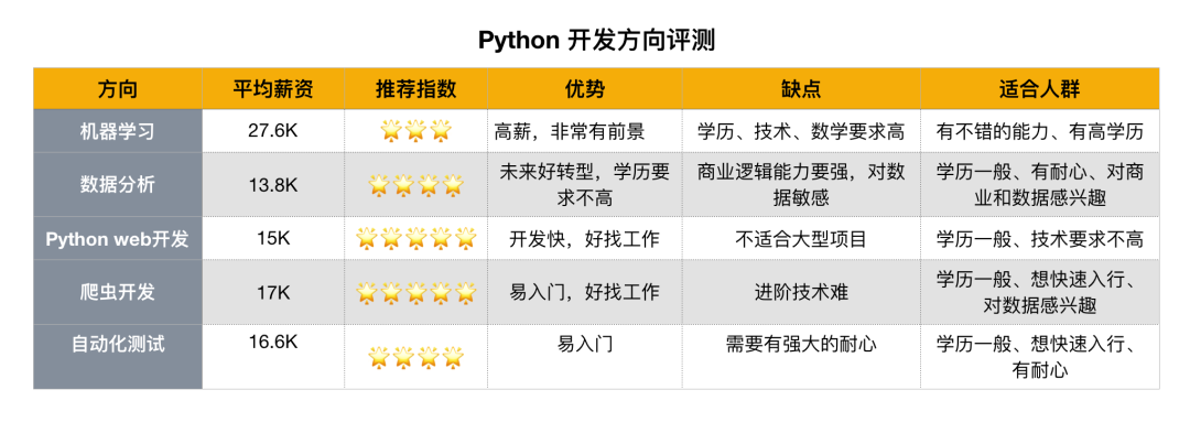 这张表格就把上面 5 个 Python 职业方向做了一个总结,清晰明了,大家一眼就能看懂。