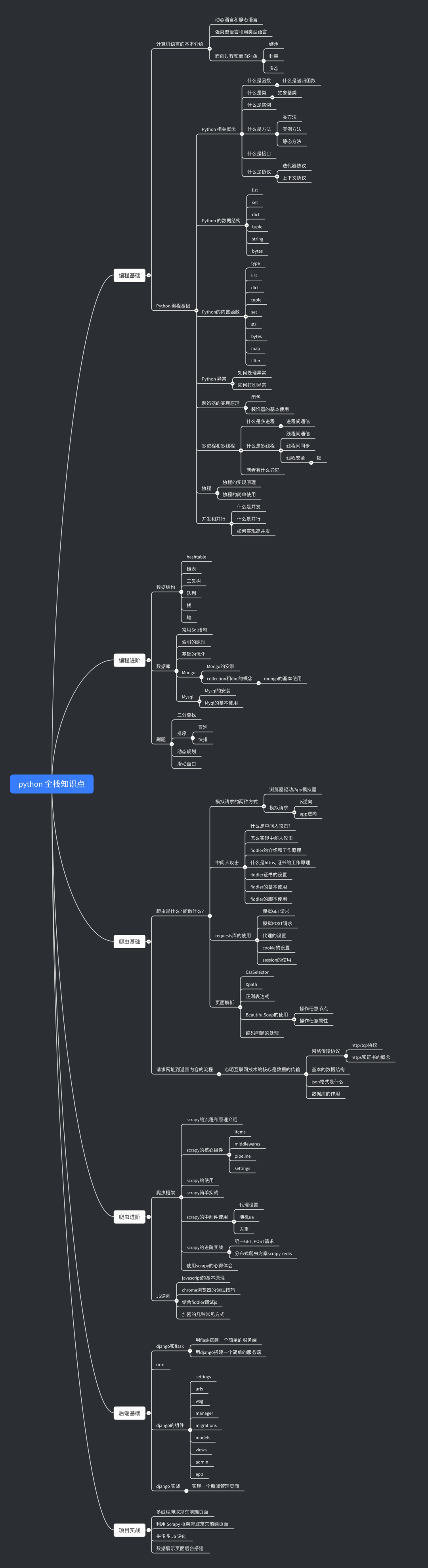 我即将举办的 Python 培训班,就是利用金子塔学习法,让大家真正的学会 Python,并找到工作。对于零基础的同学,最开始先被动学习,听我们老师的直播课程。但在被动学习的过程,我们也会让大家主动学习:我们每节课都会布置作业,每阶段都设置一个小项目考核。我们会让助教督促每个学员,都完成考核,真正的学会知识,才往下继续学习。对于编程零基础的同学来说,最重要的是有一个系统的学习方向。下面这张图就是我们给大家整理好的编程地图,也是我们教学的大纲。我们的课程完全跟着这张地图进行教学,这份知识点也是根据现在企业想要的能力进行开发,也是 Python 全栈工程师必备的内容。