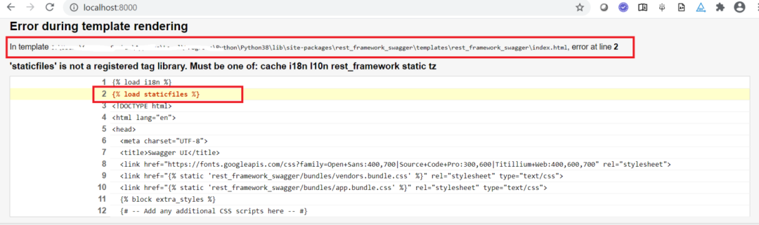 如果在访问URL http:// localhost:8000时看到以下错误,则可以编辑路径中提到的以下文件,如下图所示: