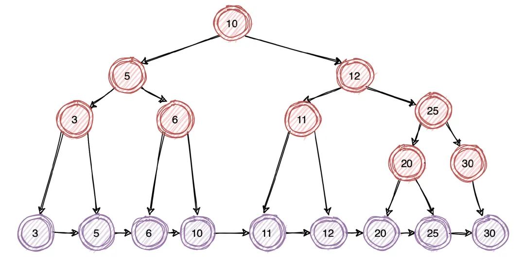 但依然不能很好的支持区间范围查找,假设我们要查询5≤id≤20 的数据时,需要先查询10节点的左子树再查询10节点的右子树最终才能查询到所有数据。