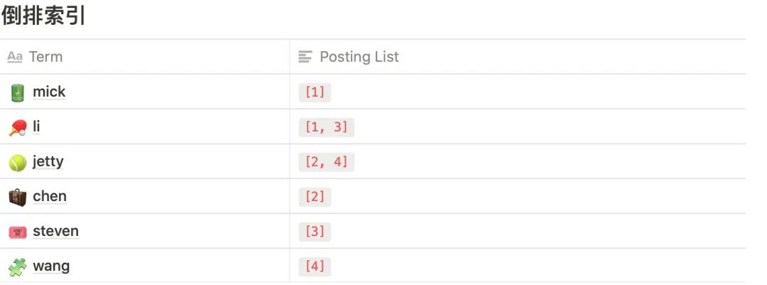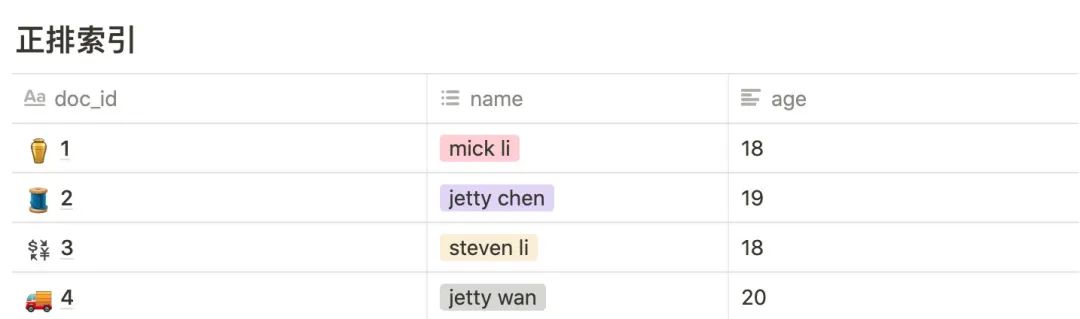 以上图为例,我们可以通过 doc_id 查询到具体对象的方式称为使用正排索引,其实也能理解为一种散列表。