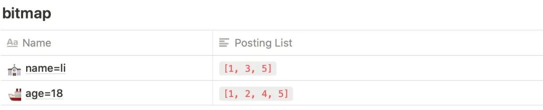 比如现在需要查询 name=li and age=18 的数据,这时我们需要通过这两个字段将各自的结果 Posting List 取出。