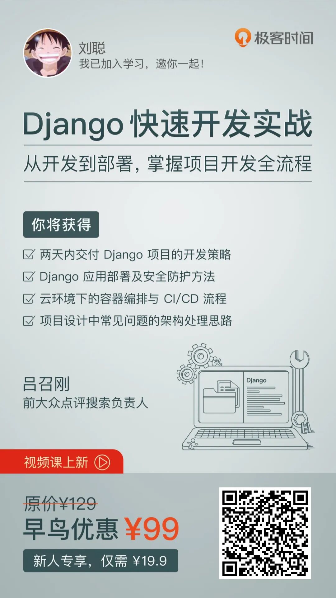 为了让更多人掌握 Django 快速开发的能力,吕召刚在极客时间推出了《Django 快速开发实战》视频课,他会带你掌握 Django 应用部署及安全防护方法,理清项目设计中常见问题的架构处理思路,最后掌握两天内交付 Django 项目的开发策略。