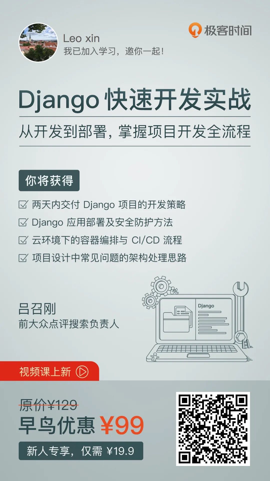 我认识一个 Django 的死忠粉——吕召刚,他在大众点评任职时,曾用两天就开发出来一个校园招聘的系统,他还用 Django 开发过内部的HR花名册系统、360 度反馈系统、数据分析系统、爬虫的数据源管理系统等等,基本上每个项目都是只用 1 - 2 天的时间就开发完成,大幅度地提高了管理和企业内部运营的效率。为了让更多人掌握 Django 快速开发的能力,吕召刚在极客时间推出了《Django 快速开发实战》视频课,他会带你掌握 Django 应用部署及安全防护方法,理清项目设计中常见问题的架构处理思路,最后掌握两天内交付 Django 项目的开发策略。