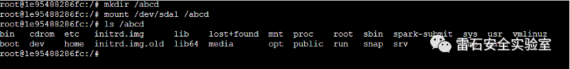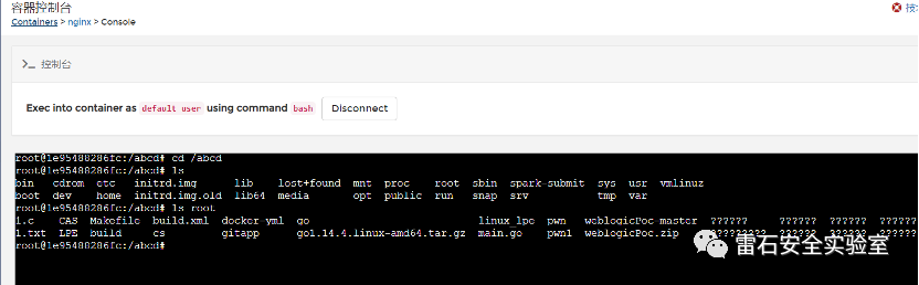 5.最终我们可以通过访问容器内部的/abcd路径来达到访问整个宿主机的目的:ls /abcd:
