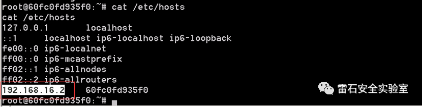 确实为docker环境,那么就看看宿主机有没有什么漏洞可以利用,使用 cat /etc/hosts,看到了主机IP为192.168.16.2: