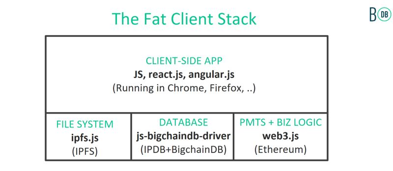 如果你想使用去中心化的计算,对于许多的情形来说,这里有一个简单的方法:在浏览器或者移动设备,可运行JavaScript和Swift这样的客户端上简单的执行就可以了。这里,你必须要相信在你的客户端上所进行的操作,但由于设备在你的手上,一般你会容易接受这点(译者注:可能会疑惑,平时就是这样做的,为什么要刻意强调。因为这里想说明的是去中心的运算是无信任任何节点,但浏览器的后端确定了,必须要相信现在配置的这个节点)。我们把这叫做胖客户端(https://blog.bigchaindb.com/bigchaindb-version-1-0-released-932bee682266)以区别于胖协议(http://joel.mn/post/148641439498/fat-protocols)框架。这个架构对于主流的web开发者来说非常好理解。举例来说,所有许多的web应用程序都需要状态。要创建这样一个程序,你需要JS + IPDB(使用js-bigchaindb-driver)。又或者你的应用需要使用到二进制的大对象存储或支付,可以包含IPFS的js版本(ipfs.js)和以太坊的js版本(web3.js)。下面是一个例子: