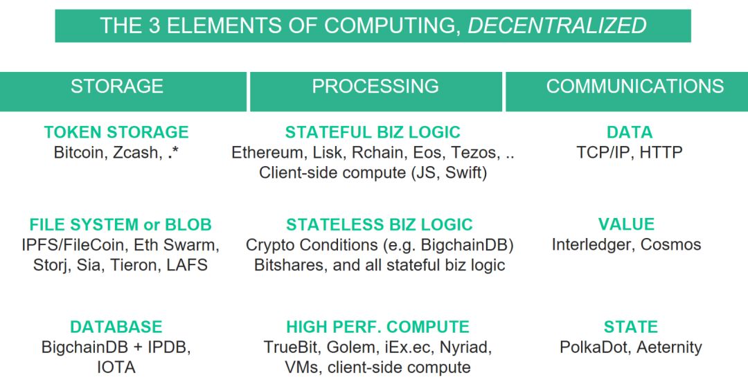 数据库 BigchainDB + IPDB,IOTA | 高性的运算 TrueBit,Golem,Iex.ec,Nyriad,VMs,客户端计算 | 状态 PolkaDot,Aeternity |