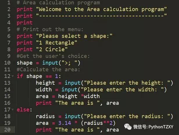 这里的elif是意思为“else if”的神秘代码:)。所以,如foo等于1,做某件事;否则,如果foo等于2,那么做另外的一些事,等等。你也可以在程序中加入其它的选项——象三角形以及任意多边形。随你的便。