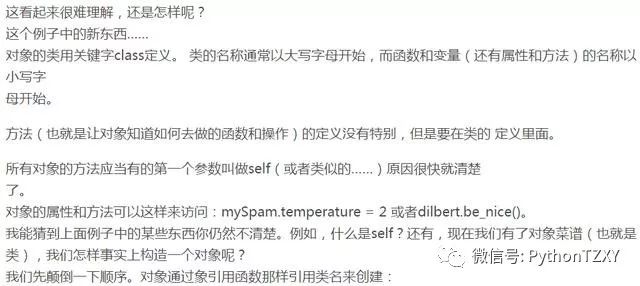 myOven.spam现在将包含mySpam。怎么回事?因为,我们调用一个对象的某个方法 时,第一个参数,通常称为self,总是包含对象本身。(巧妙,哈!)