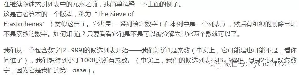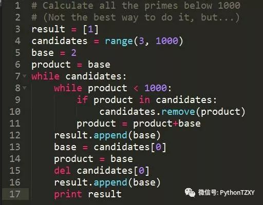 因此,我们把它加入result,并把它设为新的base,然后从列表里移除它(这样就不会对 它重复计算了)。当候选列表为空时,result列表将包含所有的素数。精巧吧,哈!