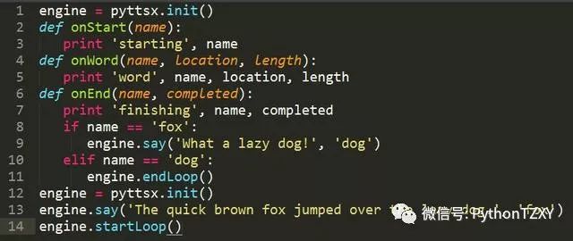 类似于设计模式中的“工厂模式”,pyttsx通过初始化来获取语音引擎。当我们第一次调用init操作的时候,会返回一个pyttsx的engine对象,再次调用的时候,如果存在engine对象实例,就会使用现有的,否则再重新创建一个。
