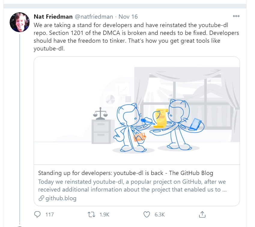 Wearetaking a stand for developers and havereinstatedthe youtube-dl repo. Section 1201 of the DMCA is brokenand needs to be fixed. Developers should have the freedom to tinker. That's how you get great tools like .