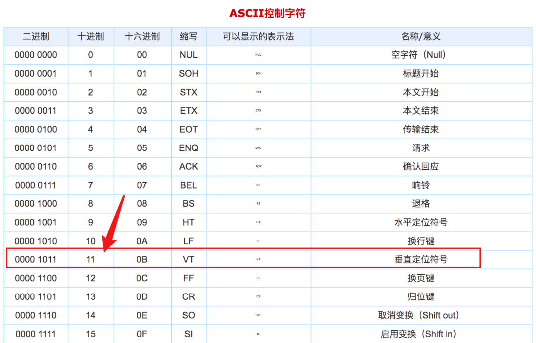 对照查看 ASCII 码表,11 对应的是一个垂直定位符号,这就能解释,为什么是阶梯状的输出字符串。