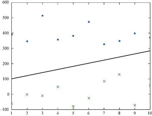 在这个线性可分数据集上对两类点做切分得到的误差可以收敛于0,而对于线性不可分的数据点集,我们无法做出一条直线使得两类点被完美分开,因此我们任意做一条分割线,可以认为在这里误差不为0,因此我们需要一个衡量误差的函数,通常称之为代价函数: