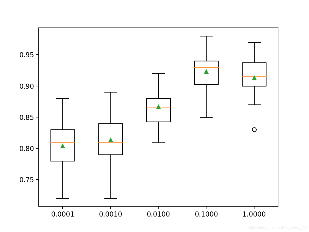 创建箱须图以分配每种配置的学习率的准确性得分。我们可以看到随着学习率增加0.1,模型性能提高的总体趋势,此后性能下降。