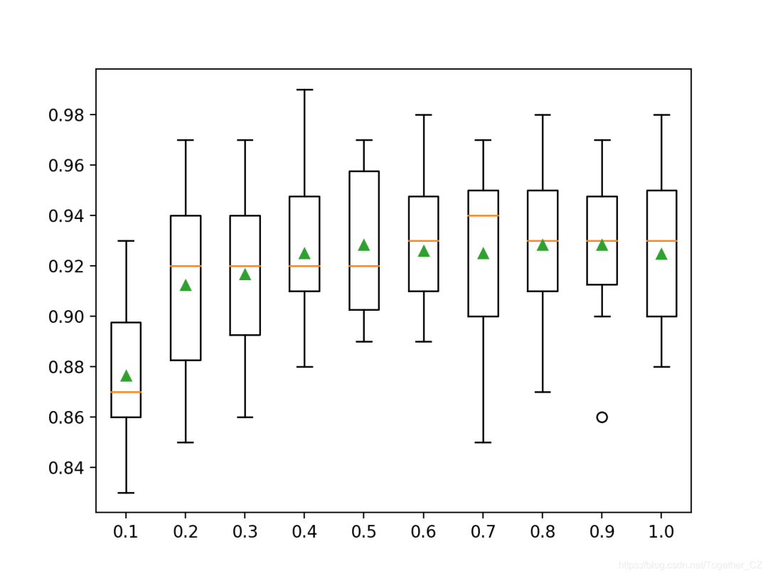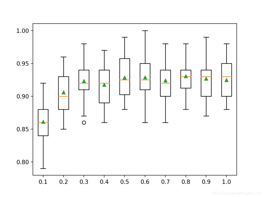 注意:由于算法或评估程序的随机性,或者数值精度的差异,您的结果可能会有所不同。考虑运行该示例几次并比较平均结果。在这种情况下,我们可以看到,平均性能对于覆盖大多数数据集(例如80%或更高)的样本量可能是最好的。>0.1 0.876 (0.027)