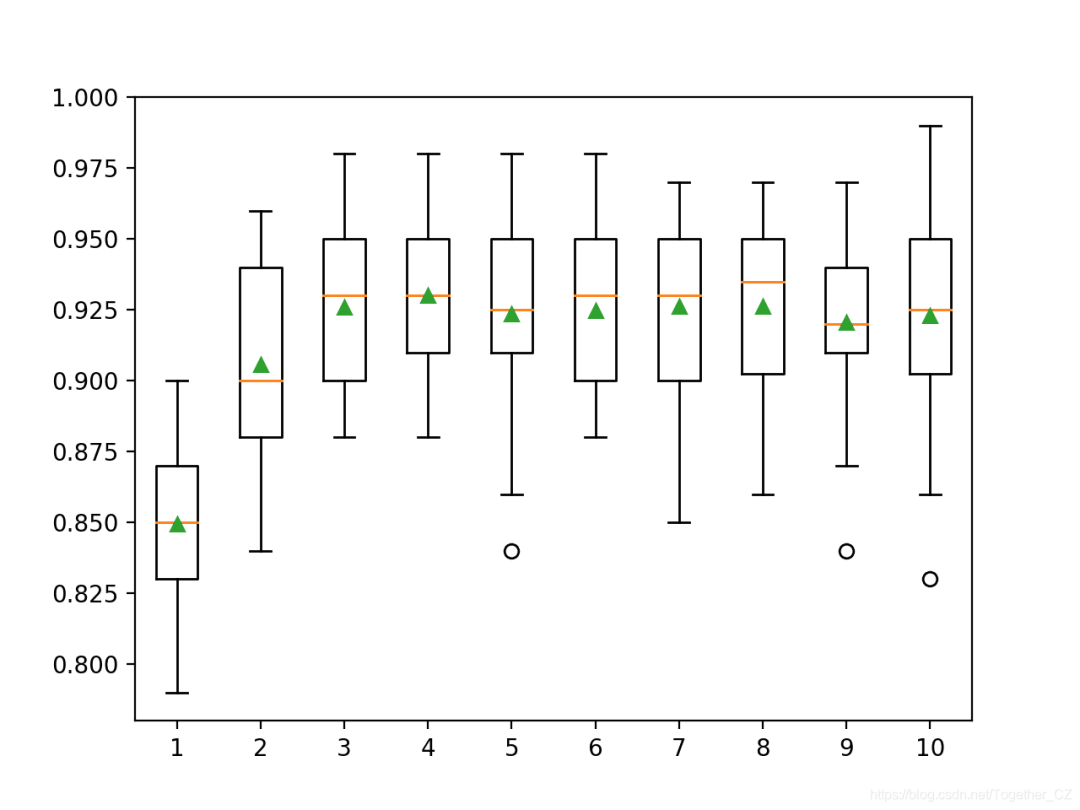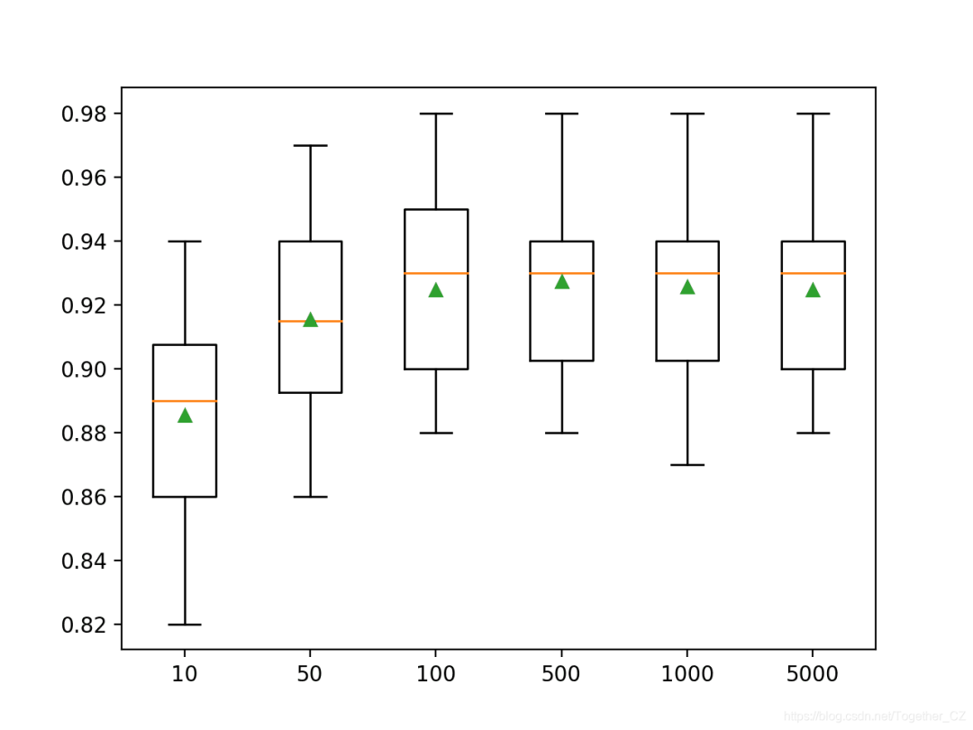 首先运行示例将报告每个已配置数量的决策树的平均准确性。注意:由于算法或评估程序的随机性,或者数值精度的差异,您的结果可能会有所不同。考虑运行该示例几次并比较平均结果。在这种情况下,我们可以看到该数据集的性能有所提高,直到大约500棵树为止,此后性能似乎趋于稳定或下降。>10 0.885 (0.029)