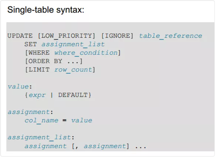 看起来,语法是完全没有问题,翻了翻MySQL官方文档的update语法: