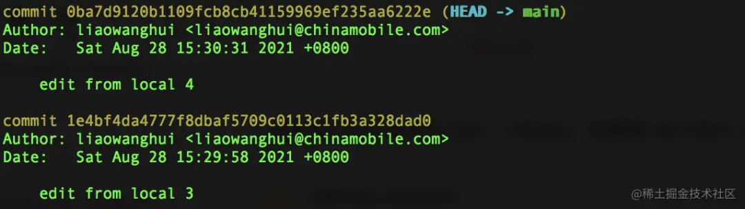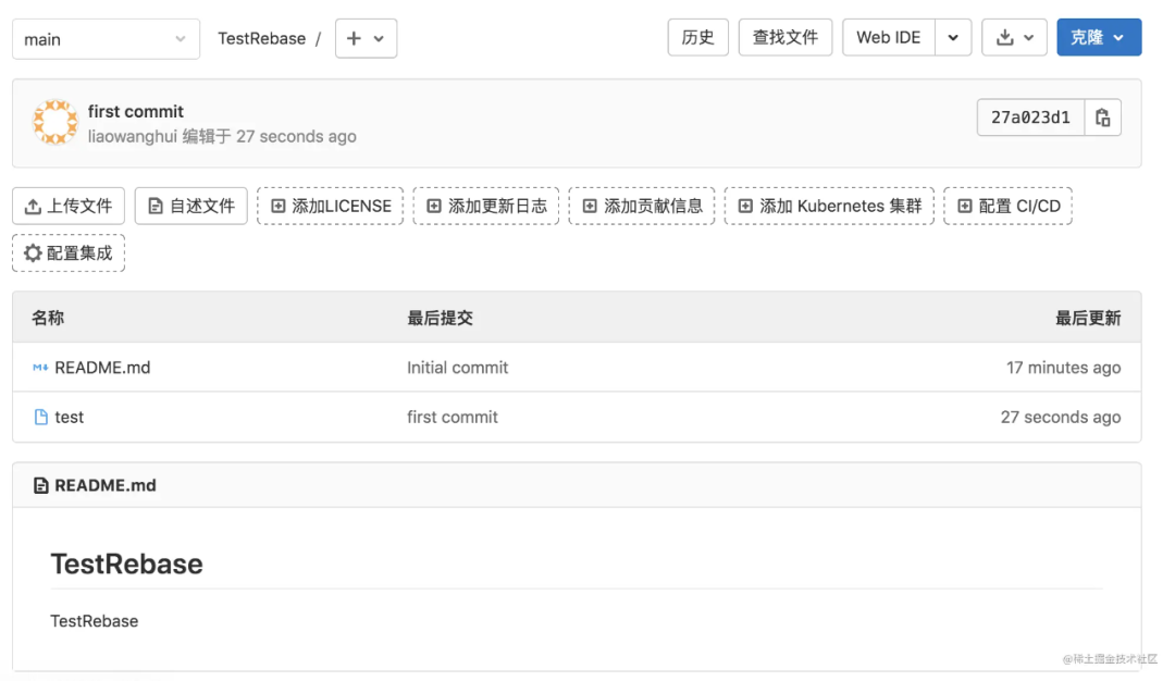 push到远程之后,在分支图可以明显看到,跟merge的区别在于,rebase不会产生分支,并且也不会产生新的提交。