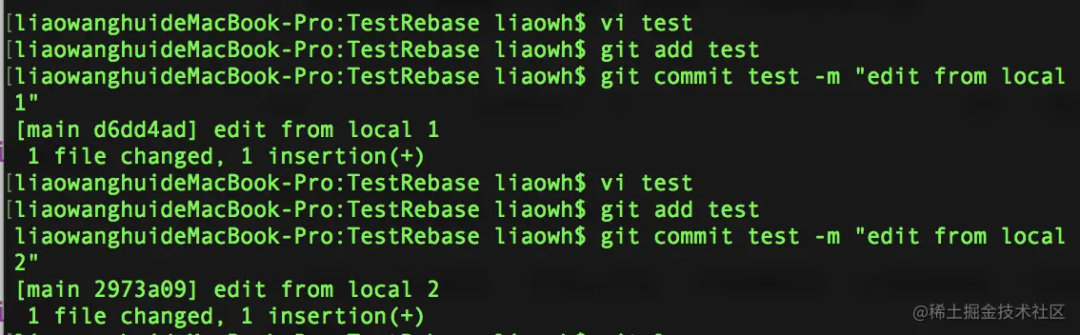 在本地修改test文件做两次commit,每次commit都在文件中加一句修改