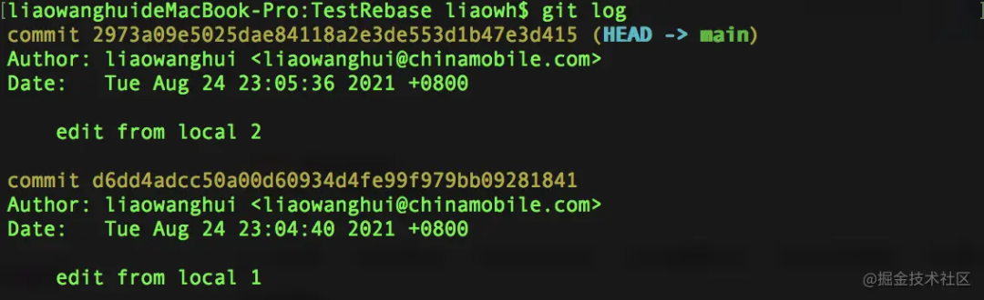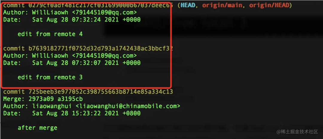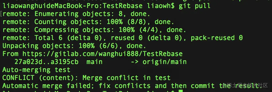 使用可以看到git pull --rebase,还是会提示我们去处理冲突,但是从git log 上可以看出明显已经发生了rebase,也就是变基,本地分支基于了远程的最新commit,而不是上次的本地commit。