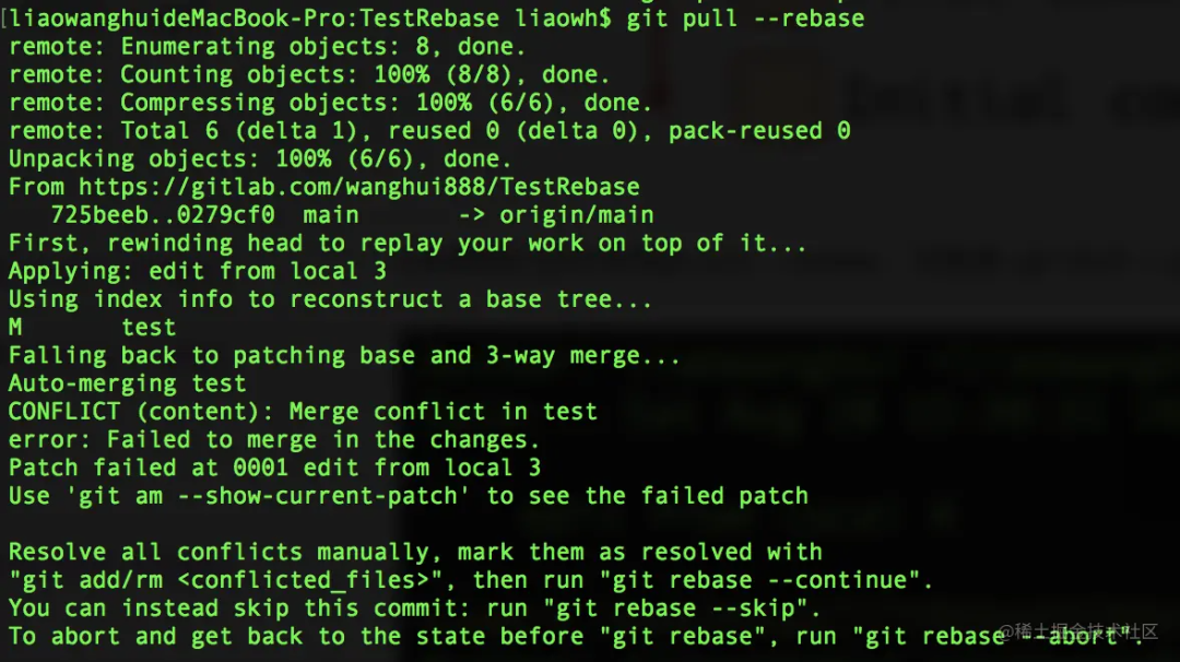 处理冲突,每处理完一次本地commit冲突,用git add标记冲突已处理完,用git rebase --continue继续处理下一个本地commit,也可以先用git rebase -i将本地的commit合并为一个commit,这样git pull --rebase就能一次处理所有的冲突。