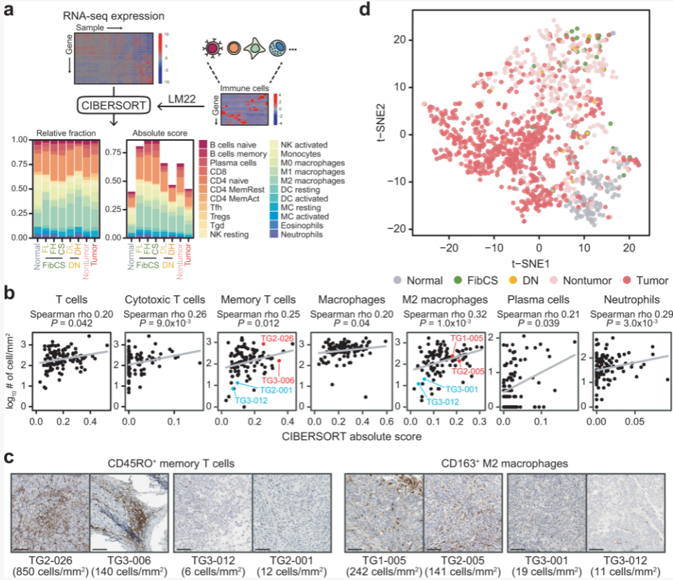 这里作者根CIBERSORT免疫分数进行t-SNE分析,将样本投影到二维坐标系。发现FibCS(肝纤维化)和DN(dysplastic nodule,癌前病变即发育不良结节)样本没有聚集在一起,并且与非肿瘤样本混合起来,且与肿瘤样本明显分离,推断出免疫浸润情况可以识别出癌前阶段的显著特征。