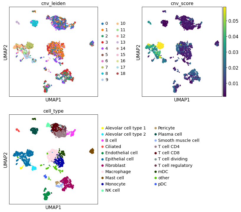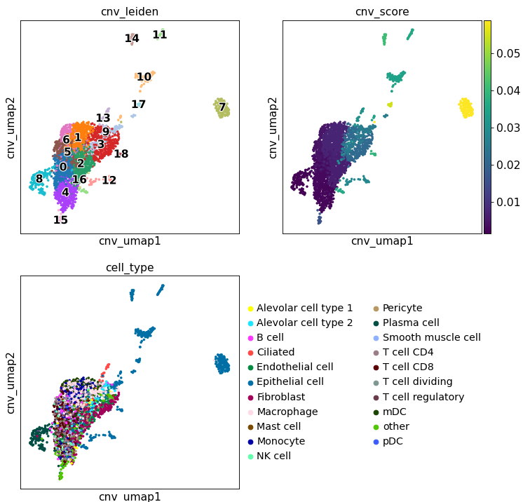 还可以在基于转录组学的 UMAP 图上可视化 CNV 分数和cluster。同样,可以看到存在属于不同 CNV cluster的上皮细胞subcluster,并且这些cluster往往具有最高的 CNV 分数。