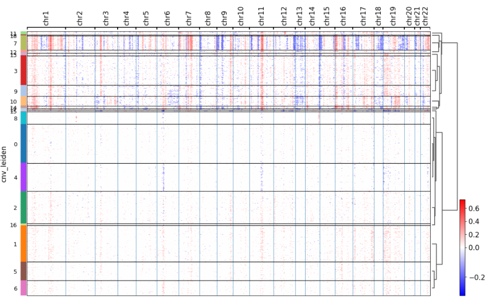 在进行leiden聚类后,我们可以通过CNV聚类来绘制染色体热图。我们可以观察到,与底部的clusters不同,顶部的clusters基本上没有差异表达的基因组区域。差异表达区域可能是由于复制数量的变化,而相应的clusters可能代表肿瘤细胞