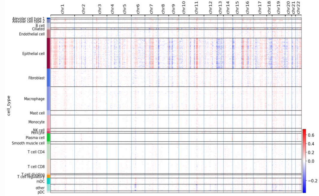 现在,可以按细胞类型和染色体绘制平滑的基因表达。可以观察到主要由肿瘤细胞组成的上皮细胞cluster似乎受到拷贝数变化的影响。