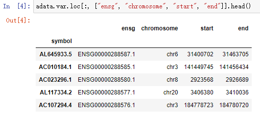 adata.var.loc[:, ["ensg", "chromosome", "start", "end"]].head()