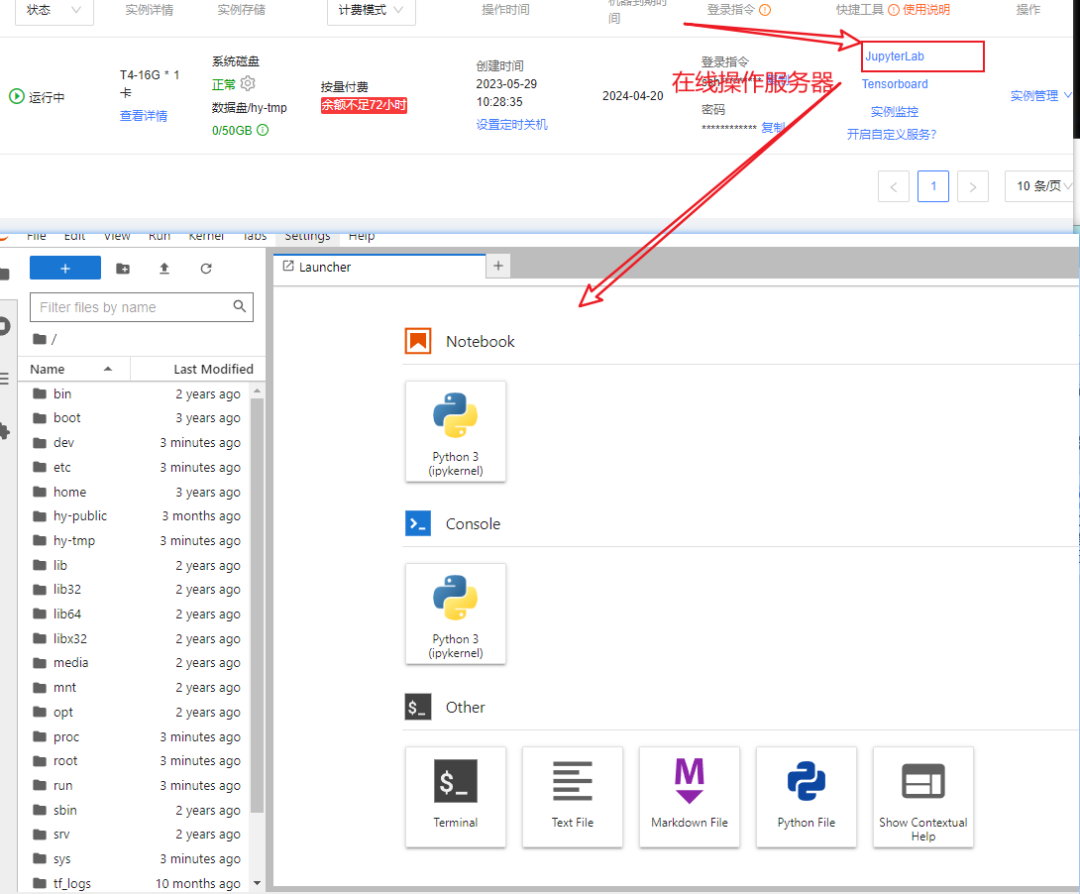 这里可以通过在线的JupterLab或者通过VScode进行远程连接,进行模型及数据集解压,环境适配等工作,就可以开始训练。