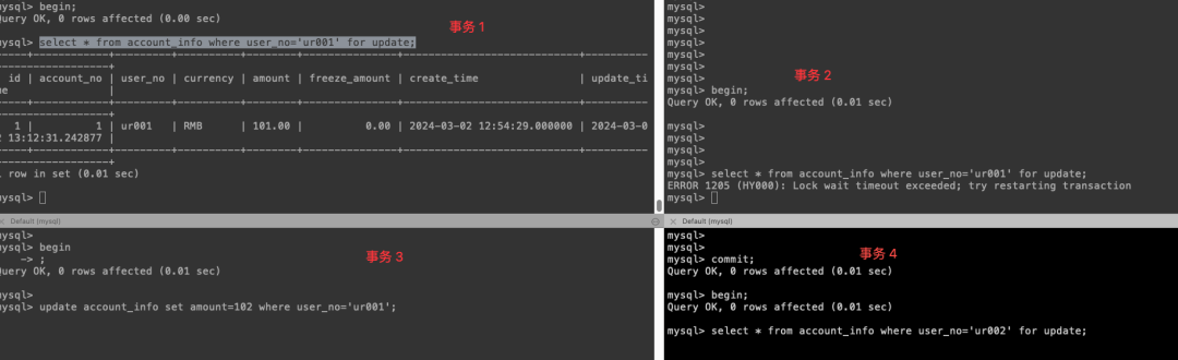 在事务 1 中,根据普通字段user_no='ur001' 进行 for update查询时,事务2、事务 3 都进行阻塞,而事务 4查询的是user_no='ur002'也进行阻塞,因此判定,根据普通字段进行 for update 查询时是表锁