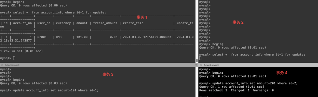 在事务 1 中,根据唯一索引account_no=1 进行 for update查询时,事务2、事务 3 都进行阻塞,而事务 4 由于更新的account_no=2 所以成功,因此判定,根据唯一索引进行 for update 查询时是行锁