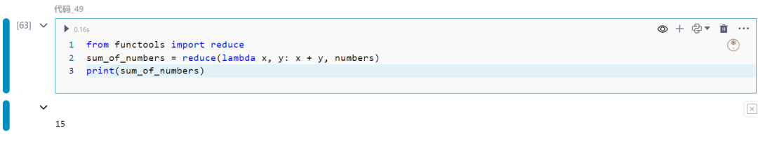 from functools import reducesum_of_numbers = reduce(lambda x, y: x + y, numbers)print(sum_of_numbers)