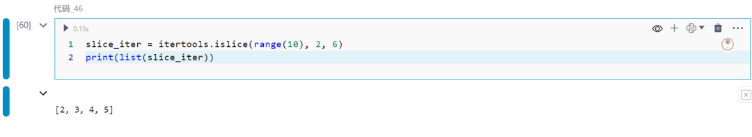 slice_iter = itertools.islice(range(10), 2, 6)print(list(slice_iter))