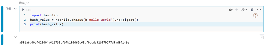 import hashlibhash_value = hashlib.sha256(b'Hello World').hexdigest()print(hash_value)