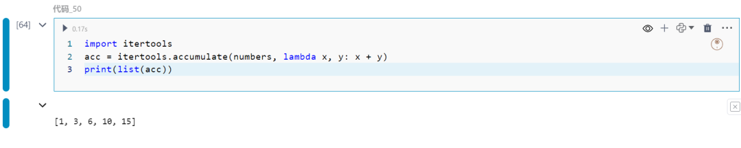 import itertoolsacc = itertools.accumulate(numbers, lambda x, y: x + y)print(list(acc))