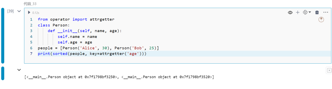 from operator import attrgetterclass Person: def __init__(self, name, age): self.name = name self.age = agepeople = [Person('Alice', 30), Person('Bob', 25)]print(sorted(people, key=attrgetter('age')))