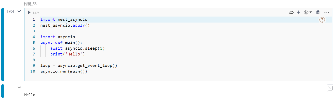 import asyncioasync def main(): await asyncio.sleep(1) print('Hello')asyncio.run(main())