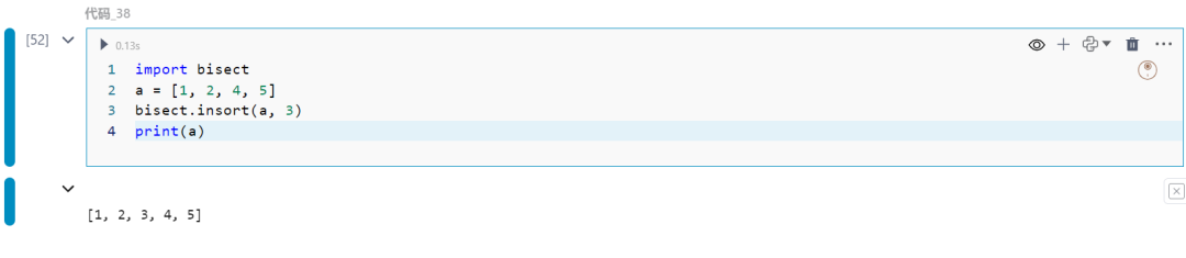 import bisecta = [1, 2, 4, 5]bisect.insort(a, 3)print(a)
