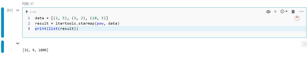 data = [(2, 5), (3, 2), (10, 3)]result = itertools.starmap(pow, data)print(list(result))