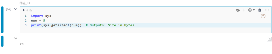 import sysnum = 5print(sys.getsizeof(num)) # Outputs: Size in bytes