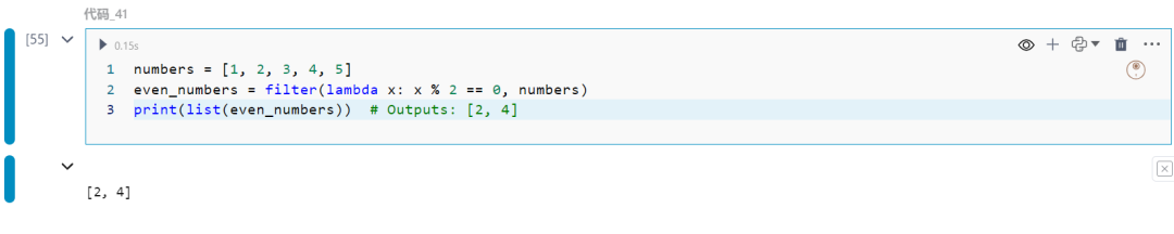 numbers = [1, 2, 3, 4, 5]even_numbers = filter(lambda x: x % 2 == 0, numbers)print(list(even_numbers))