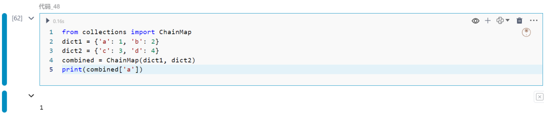 : 2}dict2 = {'c': 3, 'd': 4}combined = ChainMap(dict1, dict2)print(combined['a'])