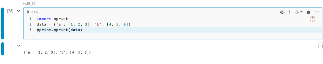 import pprintdata = {'a': [1, 2, 3], 'b': [4, 5, 6]}pprint.pprint(data)