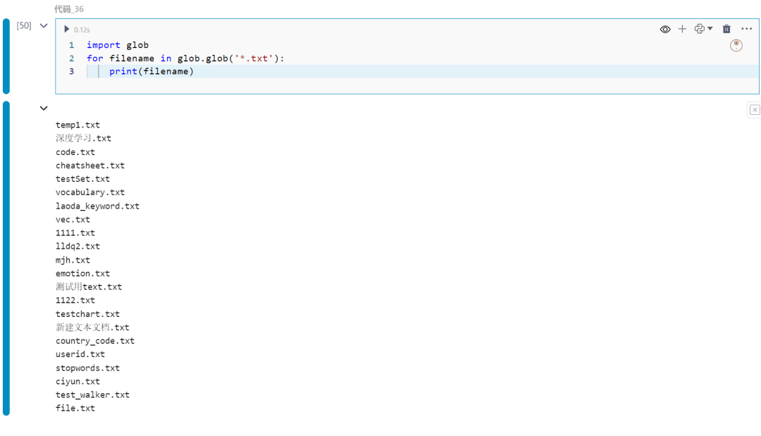 import globfor filename in glob.glob('*.txt'): print(filename)