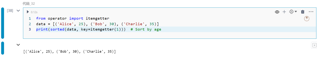 from operator import itemgetterdata = [('Alice', 25), ('Bob', 30), ('Charlie', 35)]print(sorted(data, key=itemgetter(1)))