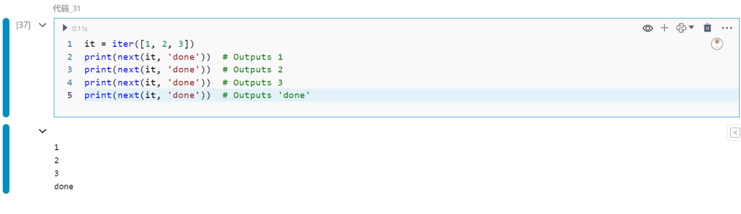 it = iter([1, 2, 3])print(next(it, 'done')) print(next(it, 'done')) print(next(it, 'done')) print(next(it, 'done'))